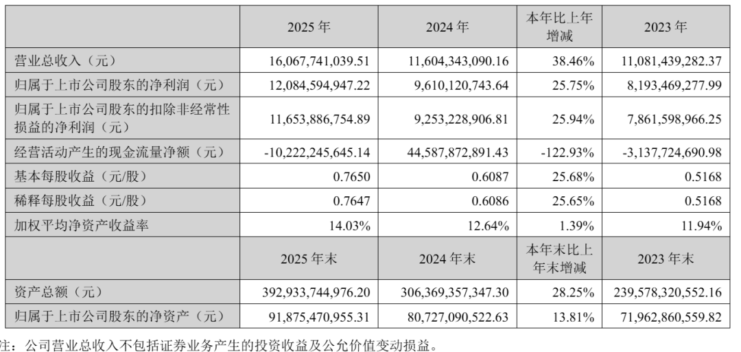 东方财富2025年净利120.85亿元,较上年同期的96.1亿元增长25.75%;扣非后净利为116.54亿元,较上年同期的92.53亿元增长26%。
