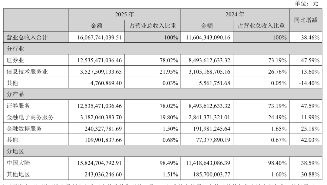 东方财富2025年来自证券业收入为125.35亿元,占比为78%;来自信息技术服务业收入为35.28亿元,占比为22%。
